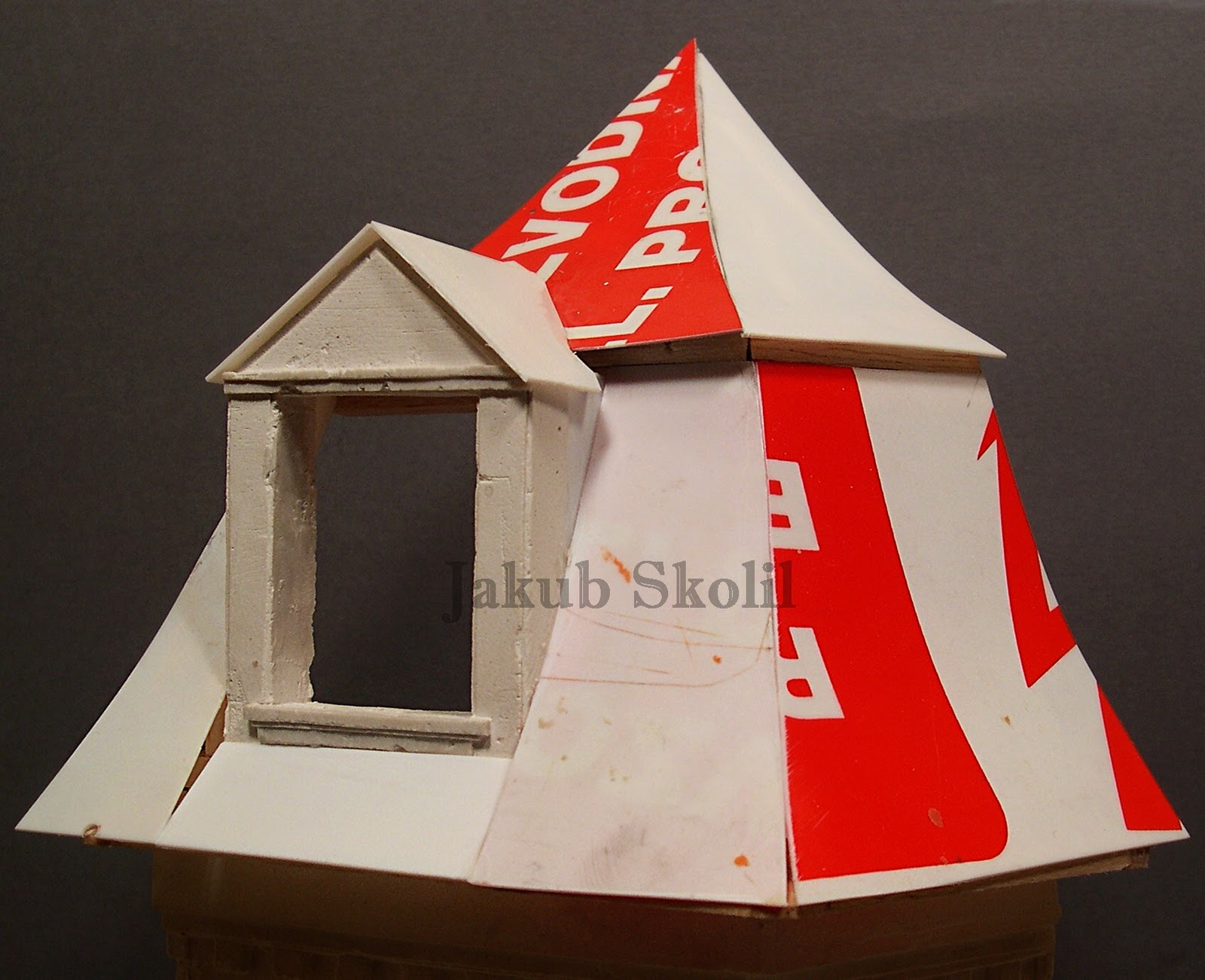 Když bylo vše hotovo, rozhodl jsem se, že dům ještě zvýším o podkrovní byteček. Ze sádry jsem proto zhotovil okenní rám, z plastové destičky vyrobil podlahu, krov je z balzových špalíčků. Vše je pevně spojeno dráty a lepidlem.