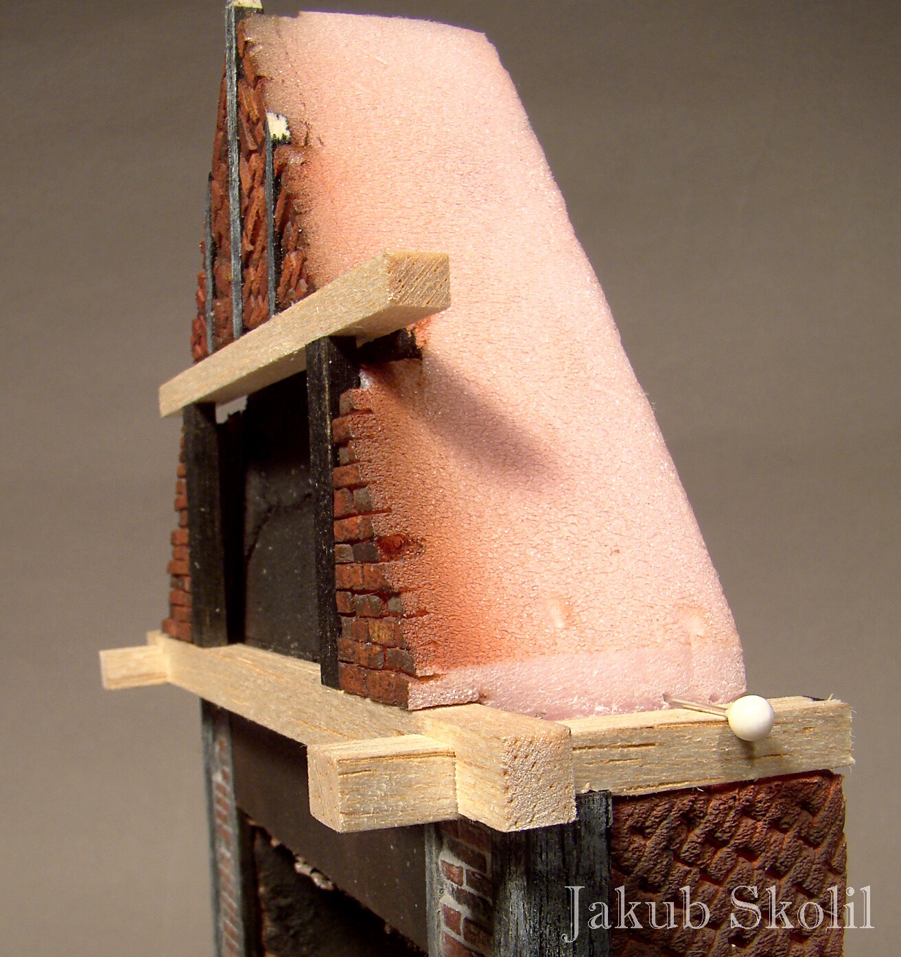 Když mám všechny pozice pro trámy připravené, všechnu balzu ze styroporu vyjmu a pokračuji ve ztvárnění cihel.