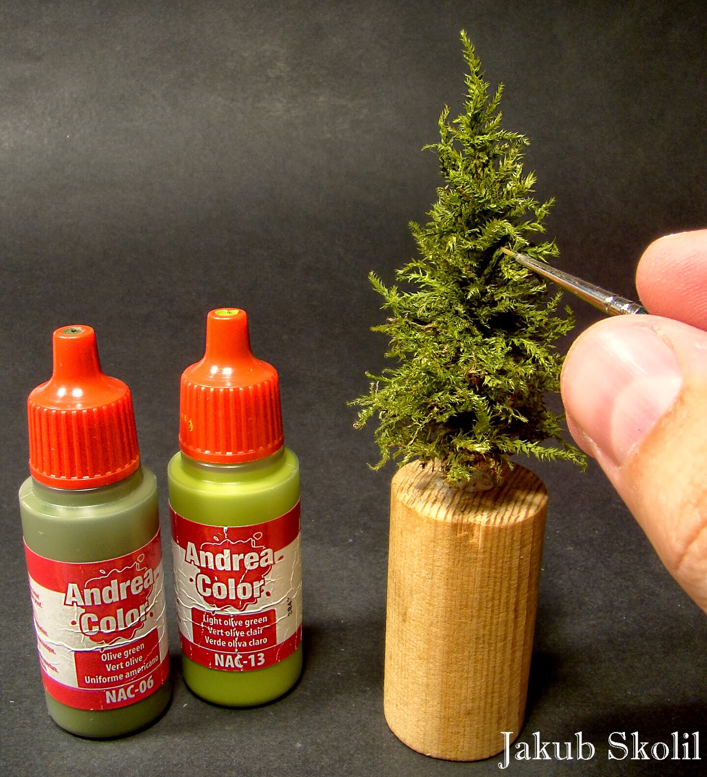 Nerovnosti vzniklé během vyřezávání jsem zahladil smirkovým papírem. Kmen mladého stromku má ve skutečnosti šedou barvu kůry, která je lehce pokrytá jehličím. To dává šedé barvě zelený nádech. Při barvení jsem použil zředěnou akrylovou barvou Andrea Olive green.