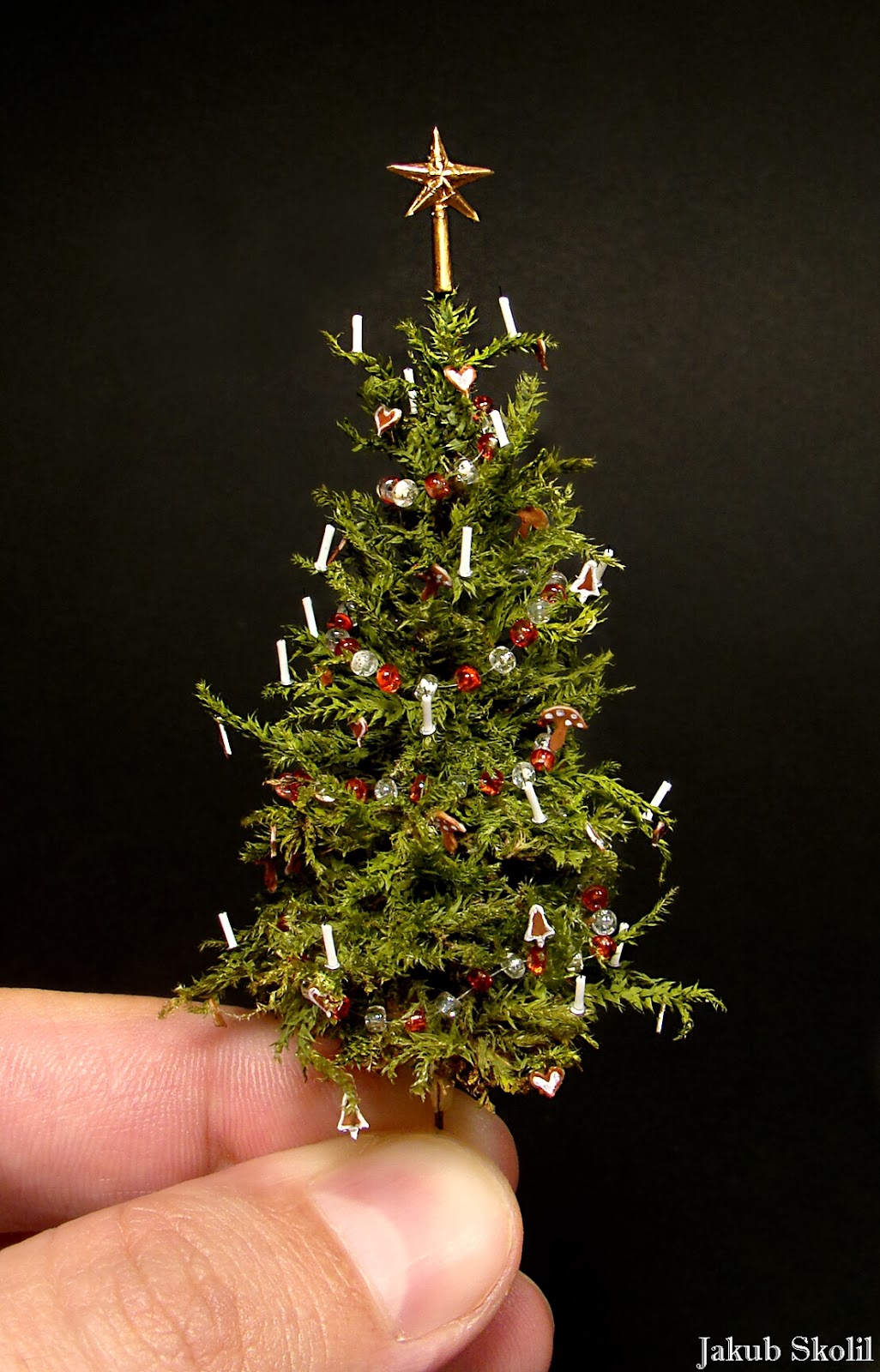 Na samotný závěr jsem hvězdu přilepil na špičku stromku pomocí měděného drátku zakamuflovaného mezi jehličí.